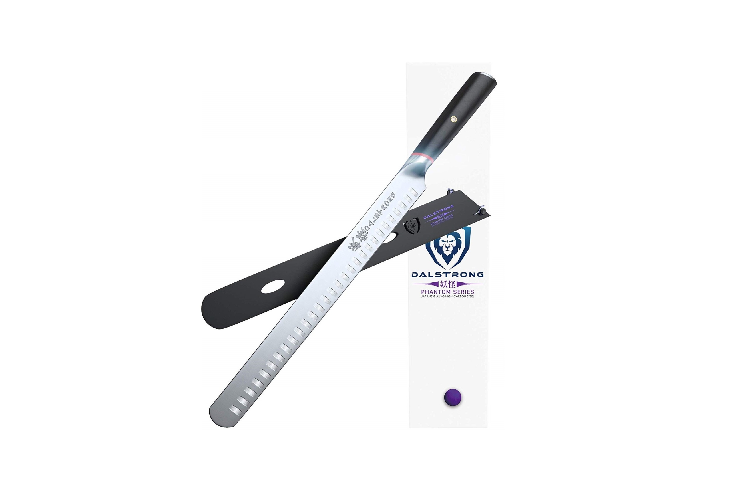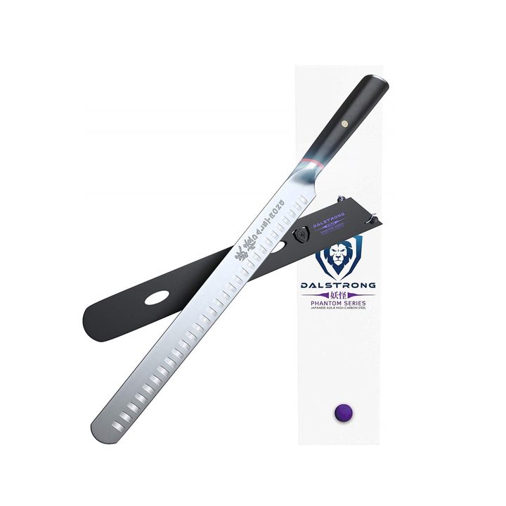 The Dalstrong Phantom Series 12-inch Slicing & Carving knife is a master-chef level slicer. With elegant design, this perfectly balanced, razor-sharp blade performs and will outlast most of your cutting boards. The ultimate weapon for tender salmon, this knife has a beautiful, hand polished satin-finish blade with refined engravings.
