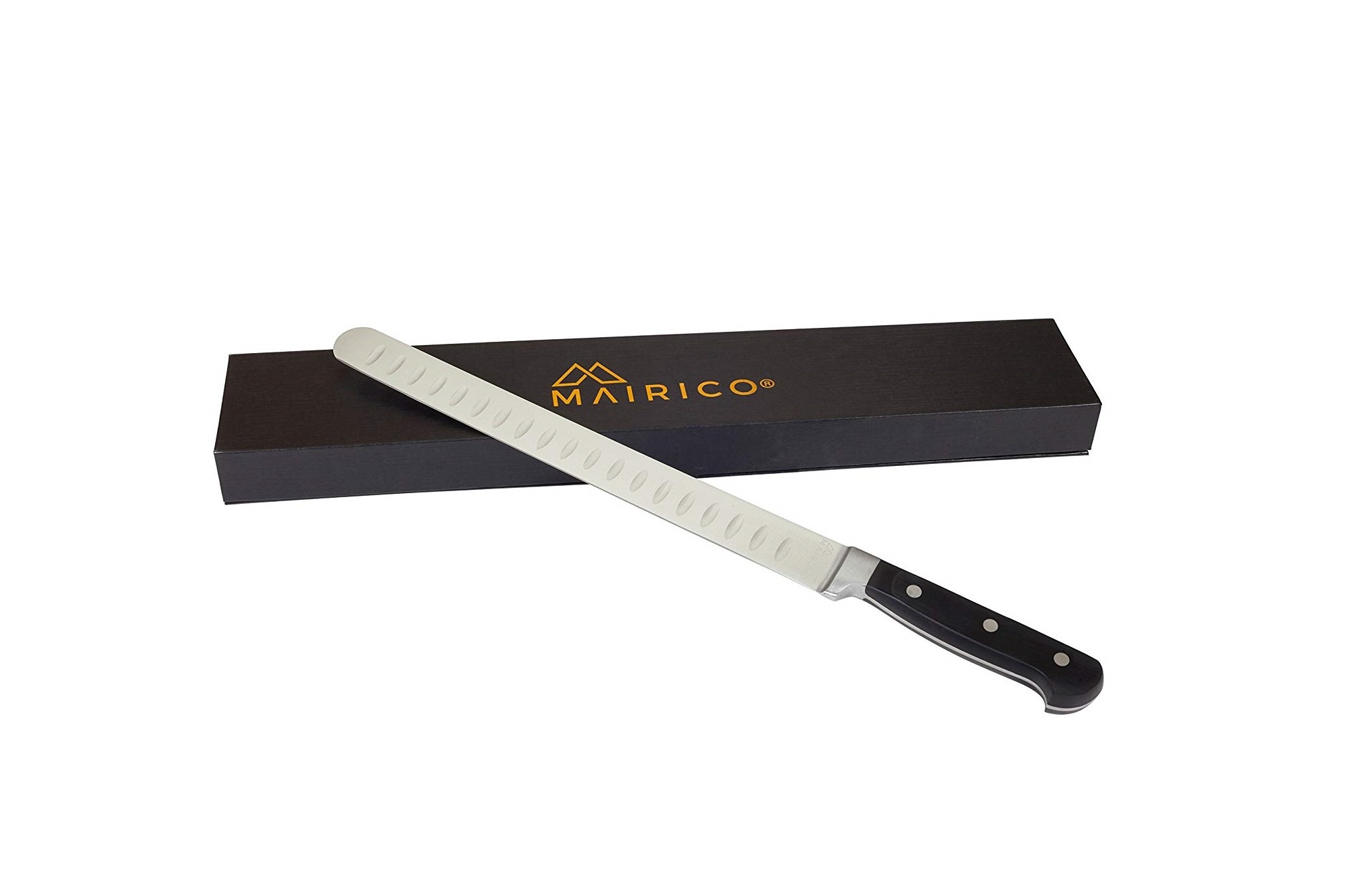 The Mairico UltraSharp Slicing Knife deserves to be in this list for the craftsmanship and value you get out of this blade. With its professional design, the 10 inches of premium stainless steel deliver top performance. Cut precisely and safely with minimal effort thanks to its ergonomic construction and secure grip. This knife also doubles as a great carving tool for briskets, turkey and other roasts.