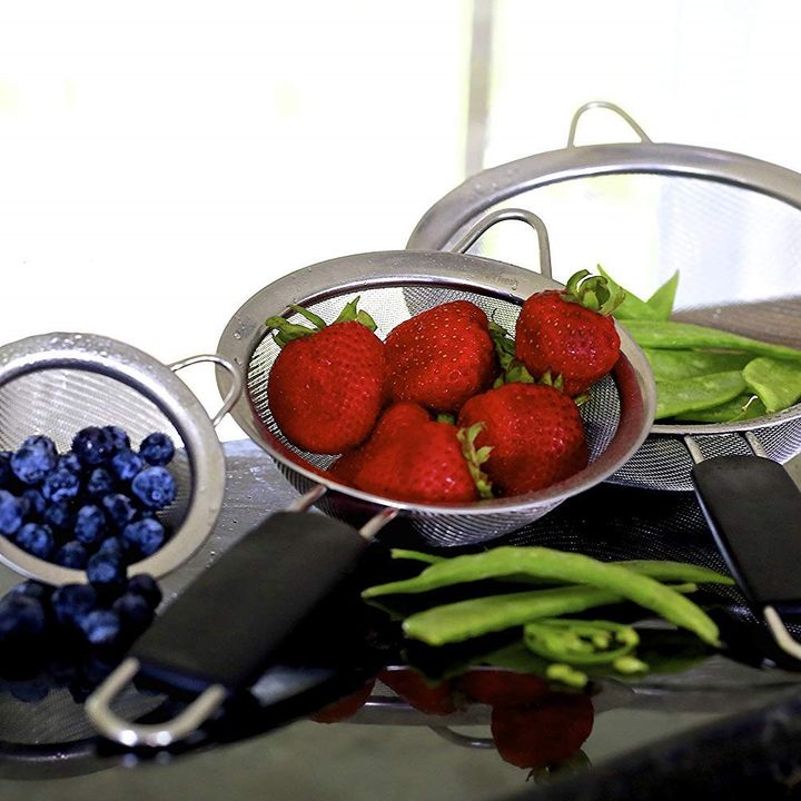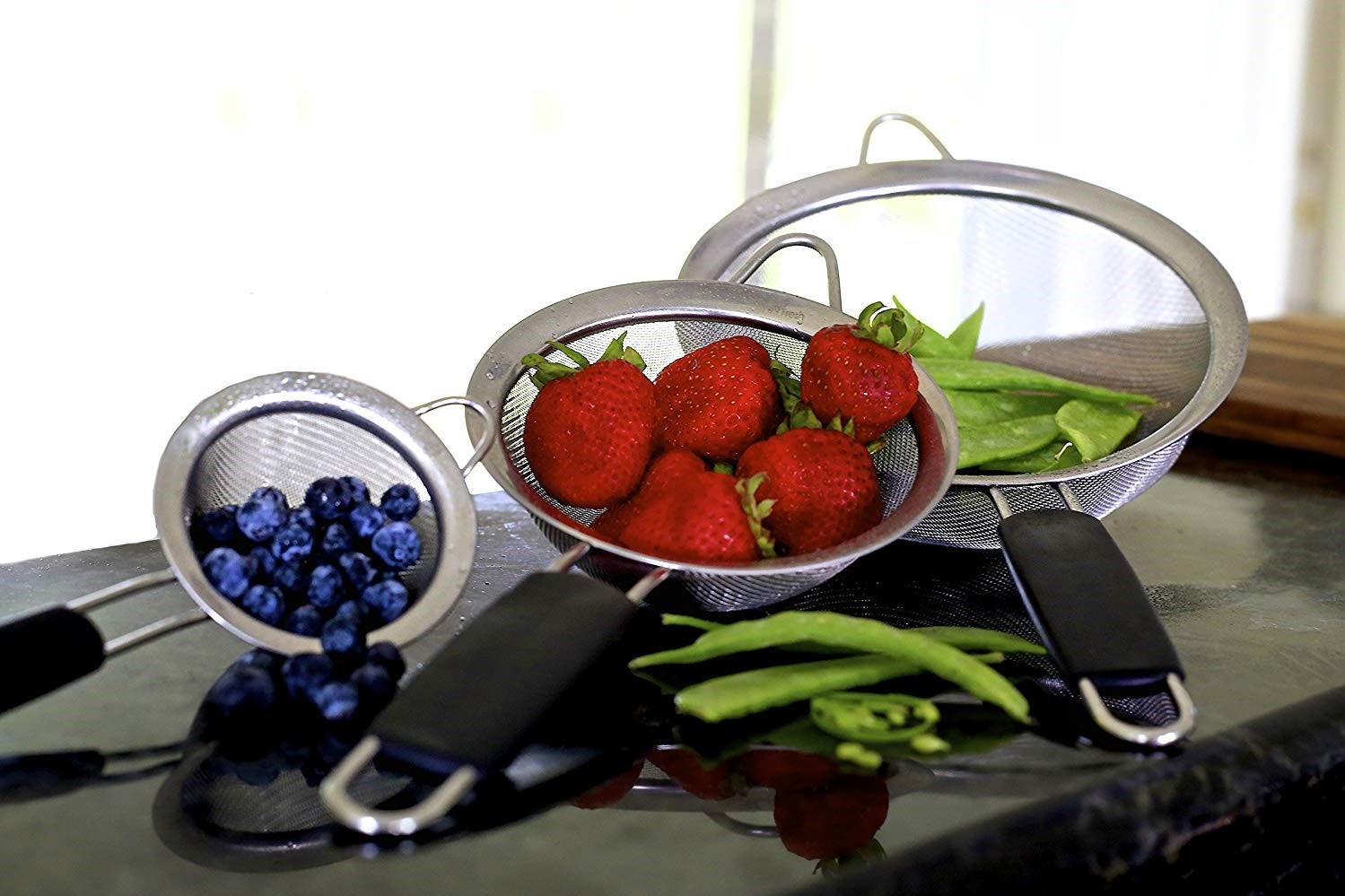 If you want a versatile option, consider LiveFresh’s stainless steel sieve set. It comes with three different-sized sieves for every cooking need from washing buckwheat to rinsing arugula. The rubber handles add more grip, making accidents less likely. This set is ideal for someone who cooks many different recipes on a frequent basis.