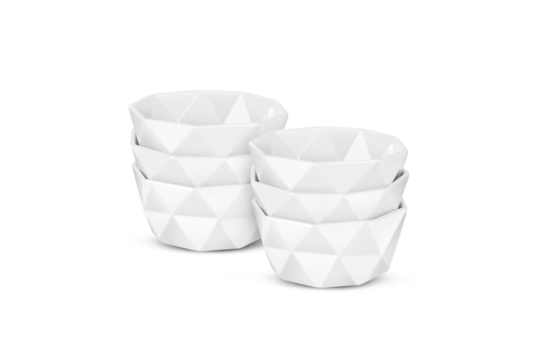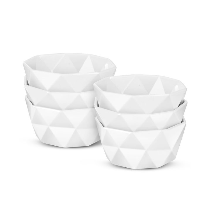 Love comes at first sight. Impress your guests before they even taste your souffle with the elegant design of the Delling Geometric 8 Oz Porcelain Ramekin Set. These artistic ceramic bowls dress up your table but are tough enough to sustain oven temperatures of up to 520 degrees Fahrenheit. The functional angles make for stronger construction and prevent chipping and breaking.