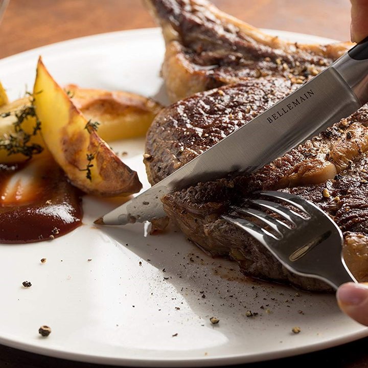 The Bellemain Premium Steak Knives takes the crown as the most beautiful steak knife available. Sold as a set of 4, this 100 percent surgical-grade, stainless steel blade has a stylish handle with superior ergonomics that make each cut easy and effortless. The full-tang construction offers unmatched strength and durability.