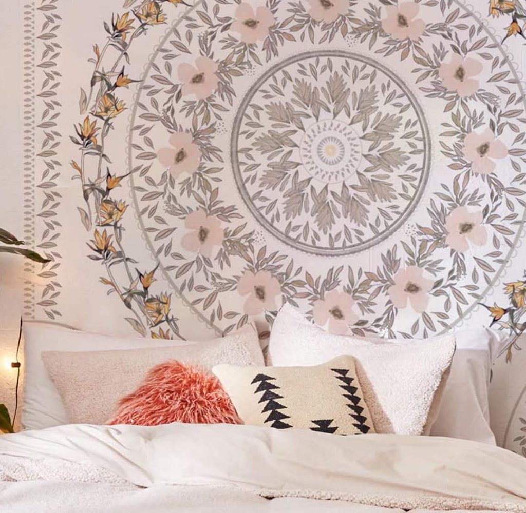 Create a relaxed and breezy atmosphere with Simkeely’s floral medallion tapestry. The tapestry features rings of flowers bordered by leaves. It comes with mounting materials: Two thumbtacks, two metal clips, and two pieces of mounting tape. The large-size tapestry measures at 59.1 inches wide and 80 inches tall.