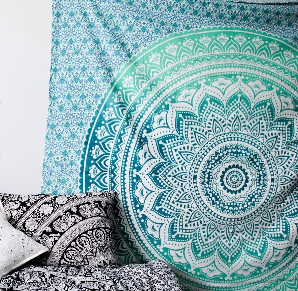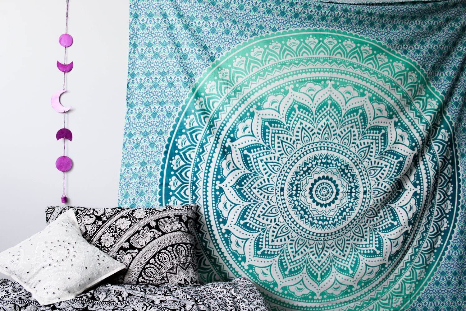 Jaipur Handloom offers an intricate mandala tapestry that rivals painted designs. It is made of 100% cotton using traditional Indian screen-printing processes. It is 5 feet by 3 feet, and it can be rotated as necessary.