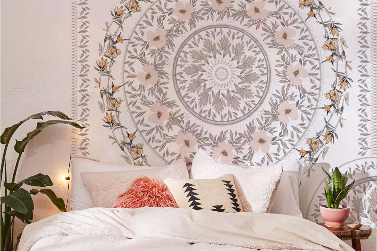 The first key element to look at when you’re considering buying a tapestry is design. Popular options include patterns like mandalas, tropical leaves, and classic stripes. Other options include graphic prints like photographs, text, or artwork. The second element is size — make sure your tapestry fits the wall you want to decorate. Lastly, consider material. If a tapestry is made of heavier material, note that mounting it might include more hardware instead of simple pins or tape. Let’s take a close look at our picks.
