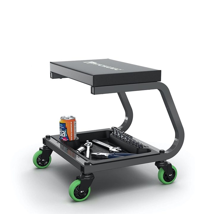 MYCHANIC offers a rolling tool tray with a comfortable stool seat for workshops and garages. Ideal for mechanics who work over long periods of time, this tray also features a drink holder and socket organizers. It is 16” L x 16” W x 17” H.