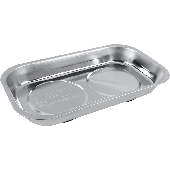 Performance Tool’s tray is magnetic, durable, and small enough to move around easily. Its measurements are 6.2” L x 6.2” W x 2” H. The magnetic-steel construction and rubber-backed magnets prevent damage for a product that will never need to be replaced.
