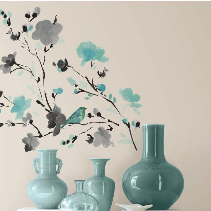 RoomMates’ watercolor wall sticker features a blue bird perched on delicate branches covered in black and teal leaves. The complete decal comes in 26 numbered pieces for easy installation. The vinyl construction gives way to smooth application and zero residue when taken off. The finished sticker measures 33 inches wide and 26.75 inches tall.