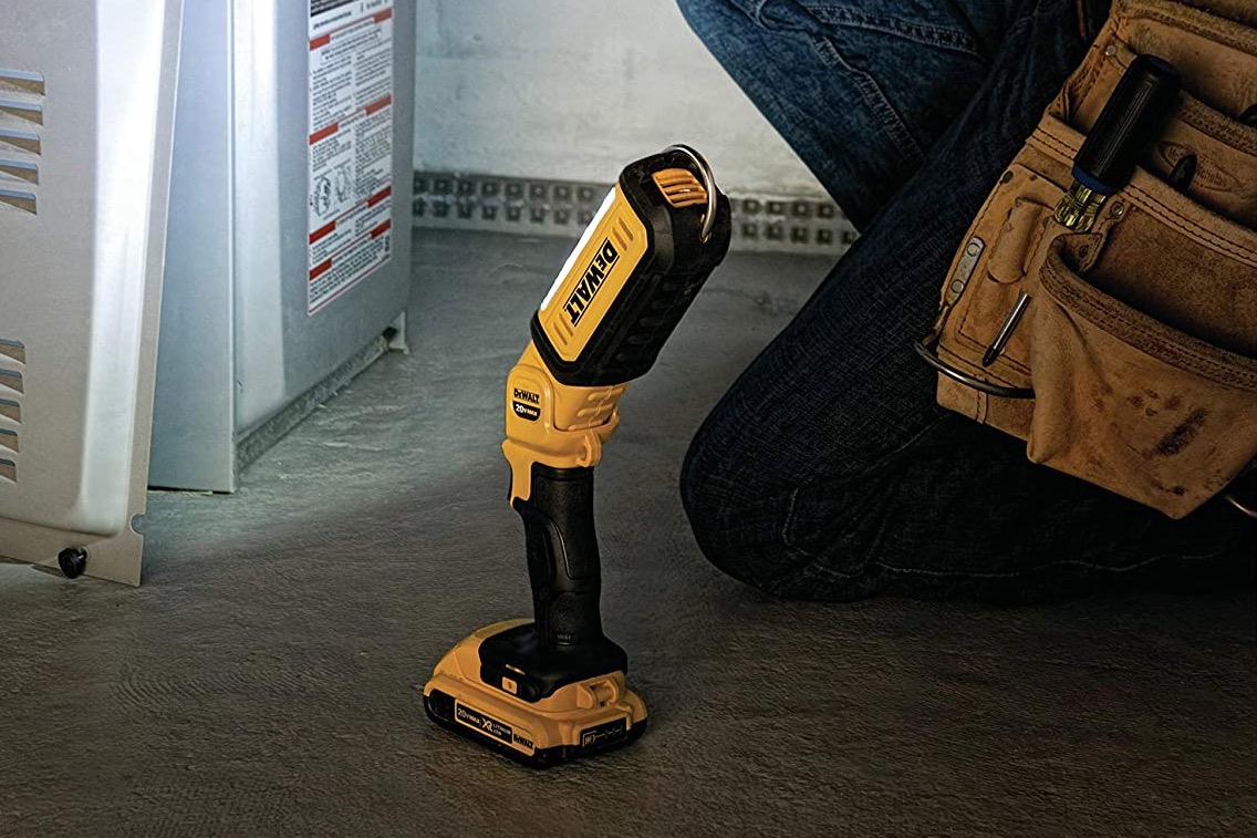 DeWalt’s portable work light is the best handheld option. A pivoting head keeps your hands free as you set it on the ground or a stable surface. Choose from two different light settings to accommodate work conditions — 250 or 500 lumens.