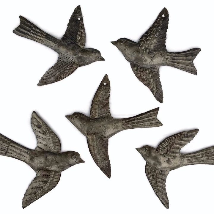 Birds in flight are the quintessential decor. This five-piece set of flying birds made of recycled metal can be found at the fair trade shop It’s Cactus – Metal Art Haiti. Because of the unique upcycled metal drum material, the colors range from dark silver to warm bronze. Each bird measures 6 inches long by 5 inches tall and 1 inch wide.