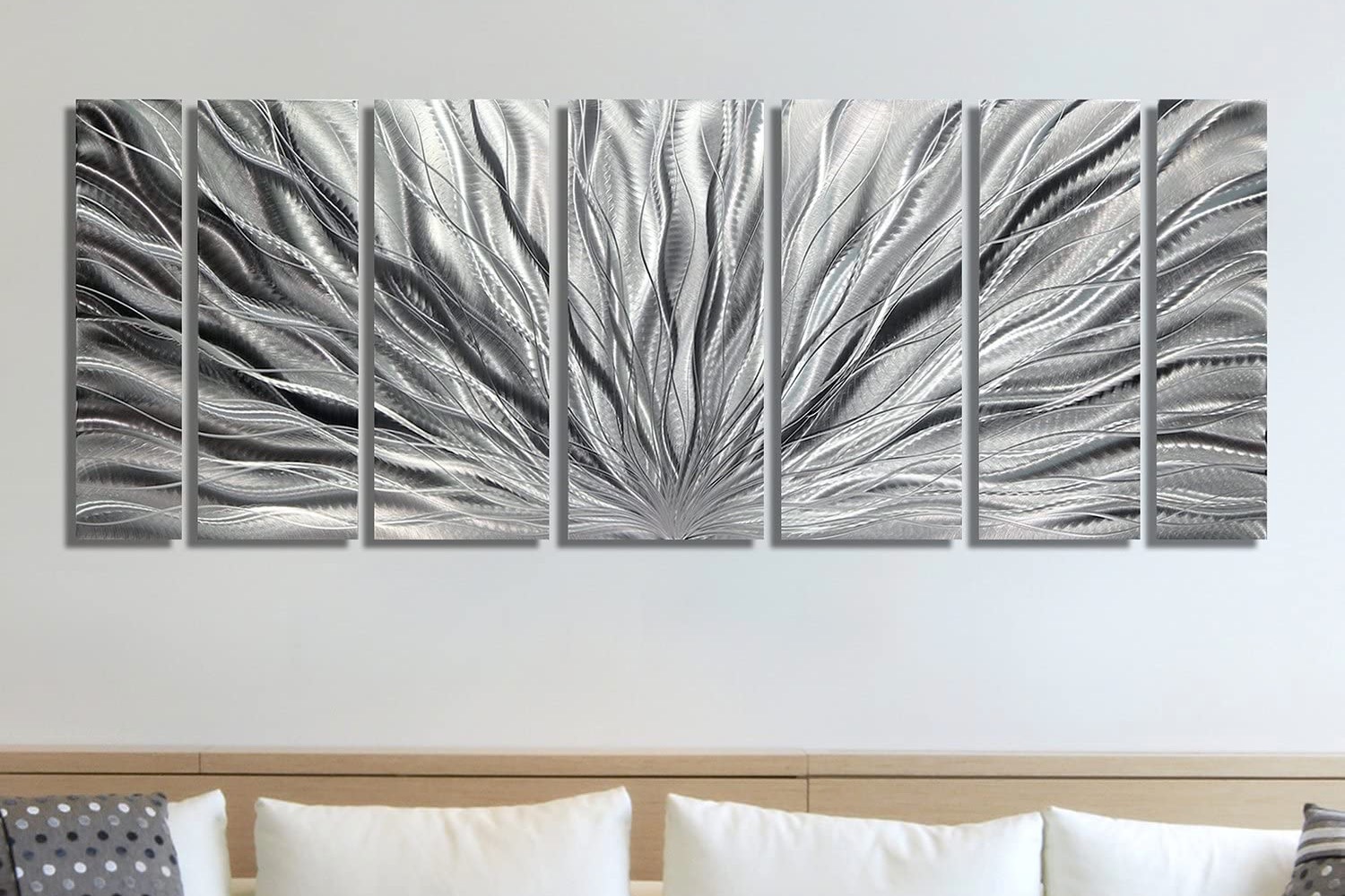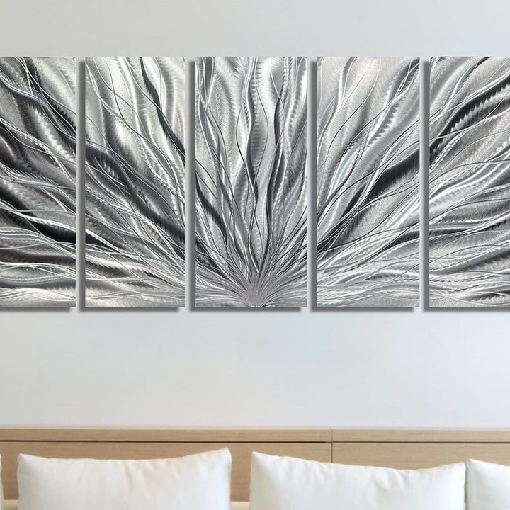 This handmade seven-piece metal wall art from Statements2000 depicts plumage etched onto aluminum. Lines radiate from the bottom center in grays, whites, and blacks to create a sense of action. Installation is easy as the panels come ready to hang. The entire piece measures 68 inches long by 24 inches tall.