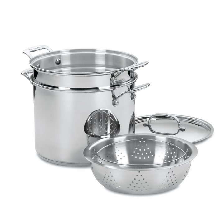 Multifunctional by design, the Cuisinart Pasta/Steamer Set includes four pieces of functionality to help you make the best pastas ever. Boil, strain, and steam with this useful kit that is made from stainless-steel encapsulated aluminum, for even heating and quick boiling.