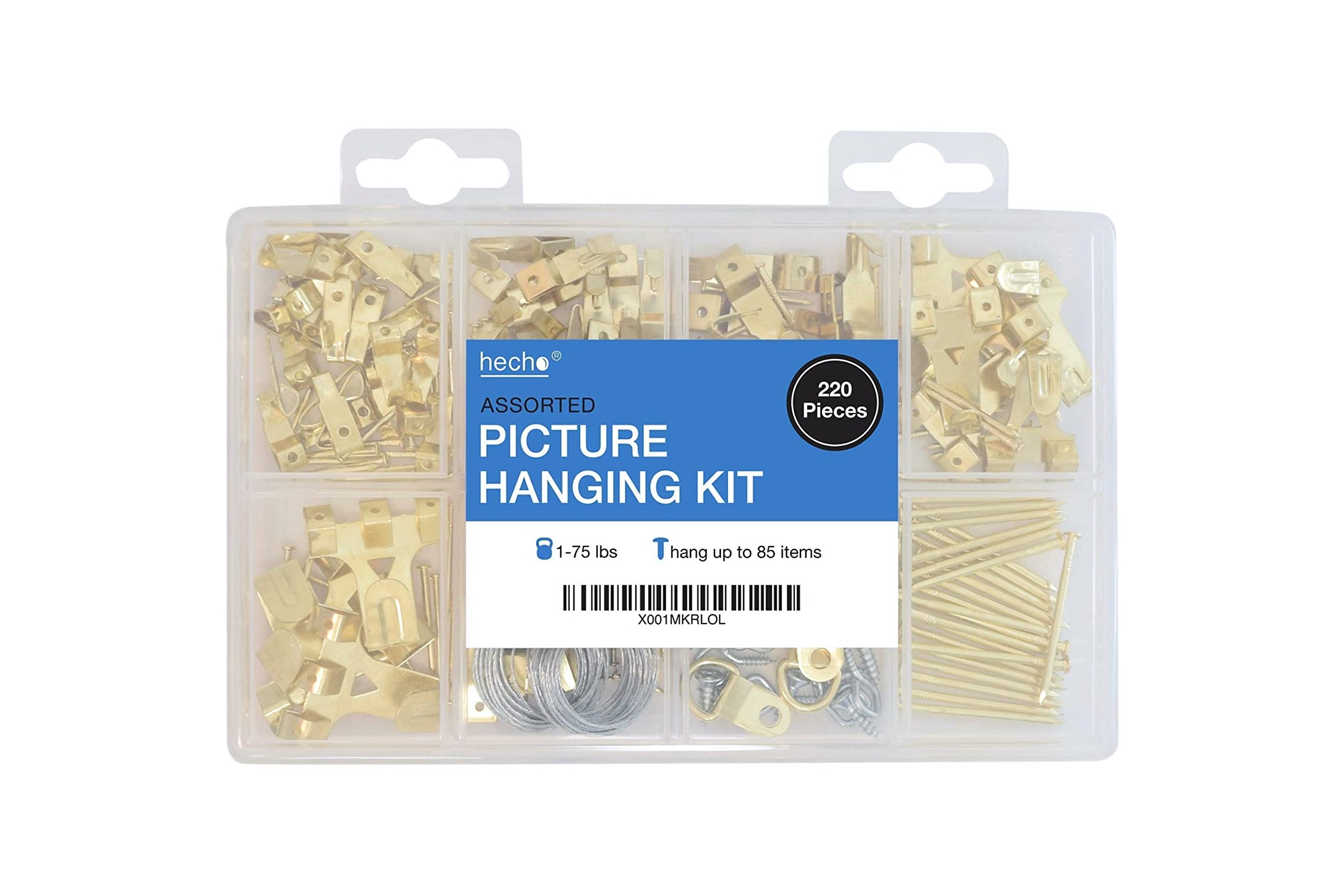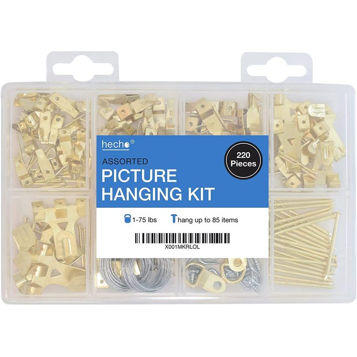 The hecho Assorted Picture Hanging Kit includes a variety of supplies to hang up to 85 pictures. It includes 220 pieces of wire, picture hangers, hooks, nails, and other hardware to mount your favorite artwork. The box has dividers and hooks with corresponding nails for ease of use and improved organization.