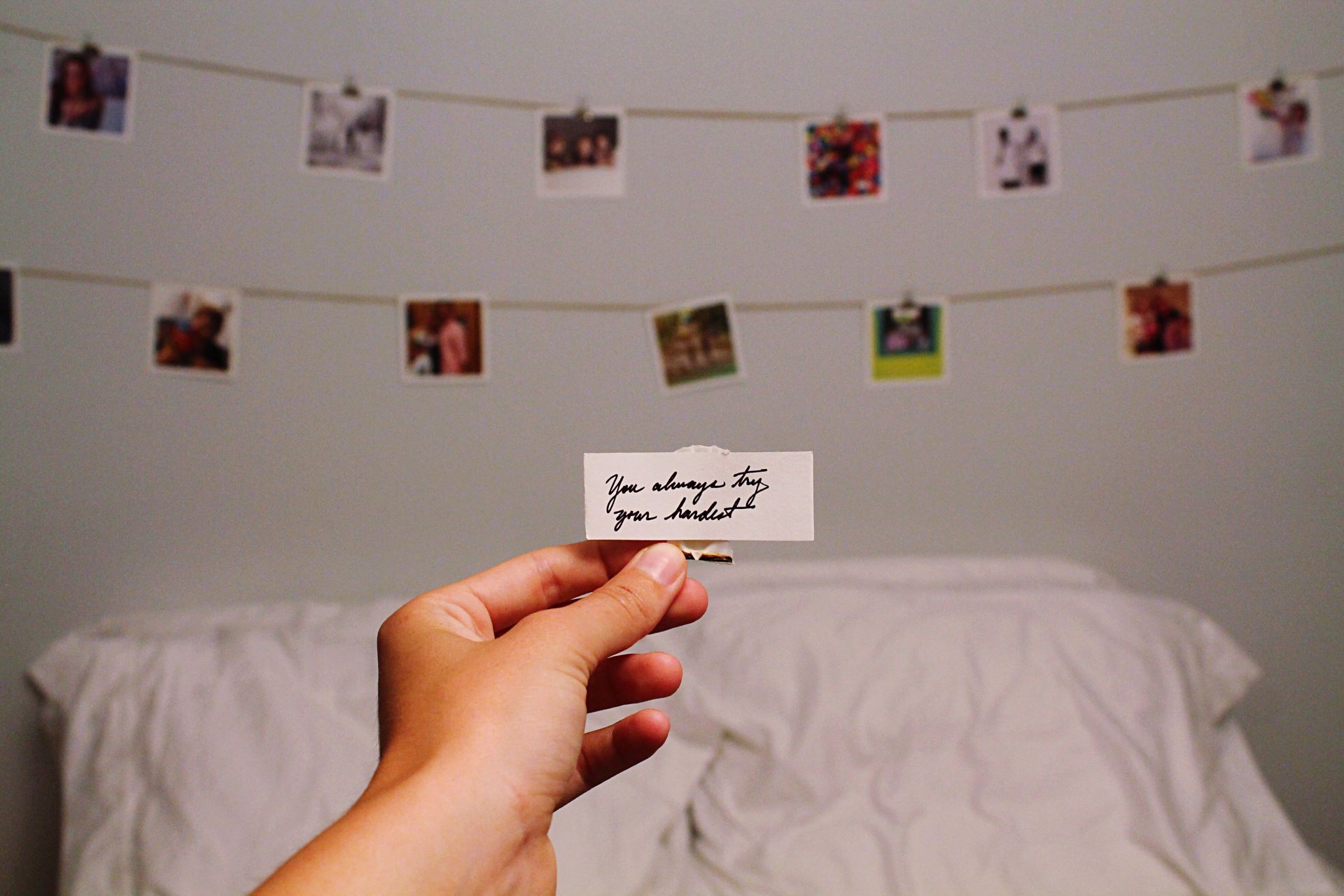 String a series of pictures across the wall, one right above the other (as shown below), to display beloved family photos without frames. This could also work well for post cards to highlight family travels, or holiday cards you’ve exchanged with others.