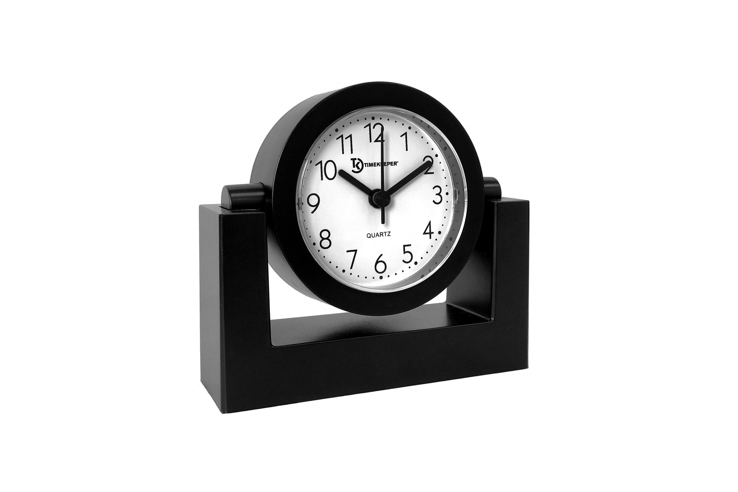 To view a desk clock from any angle, a swivel feature is key. The Timekeeper Desktop Swivel Clock ranks high among clocks in its class. Its swivel body can angle the clock face for easy viewing on a desk, shelf, or tabletop.