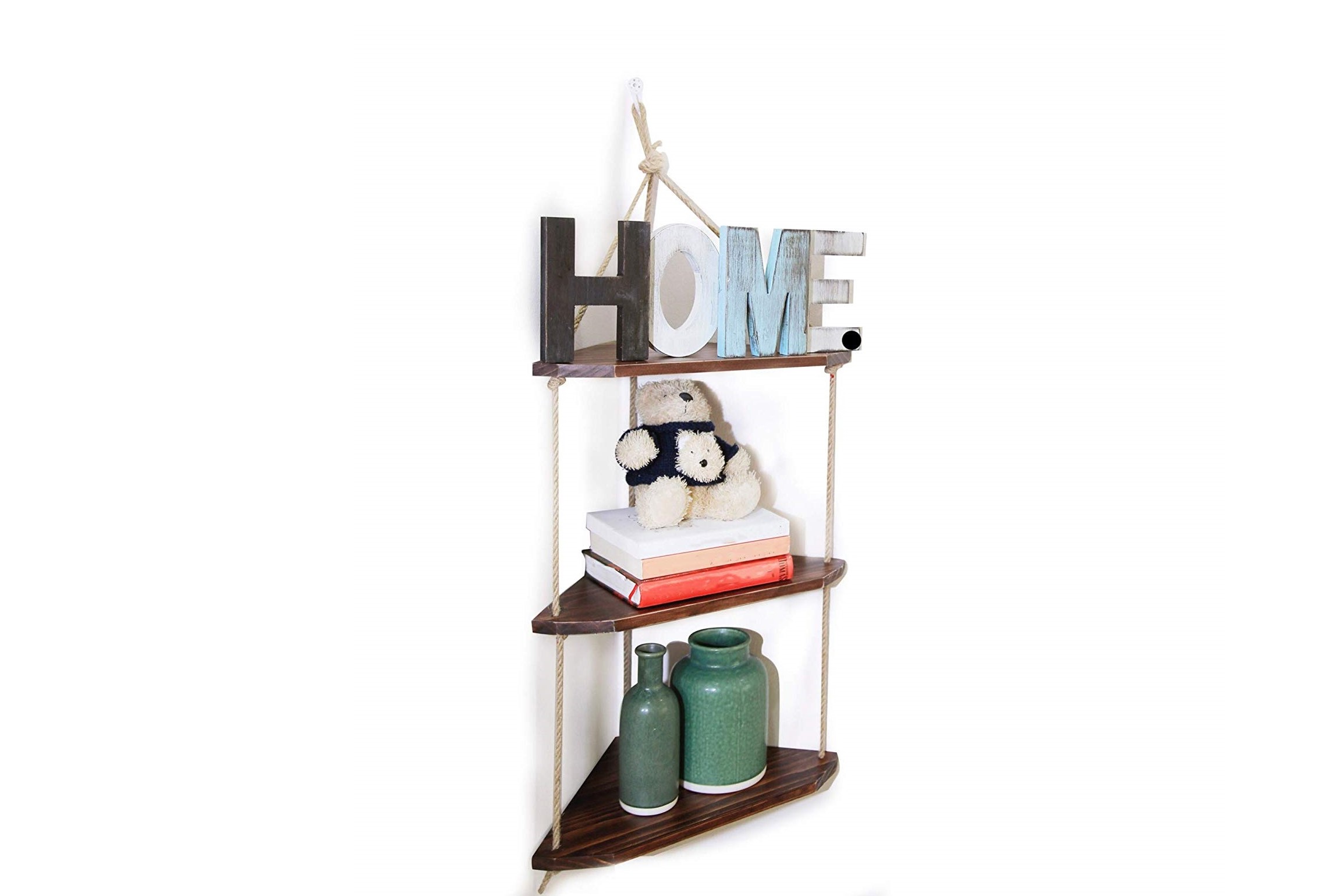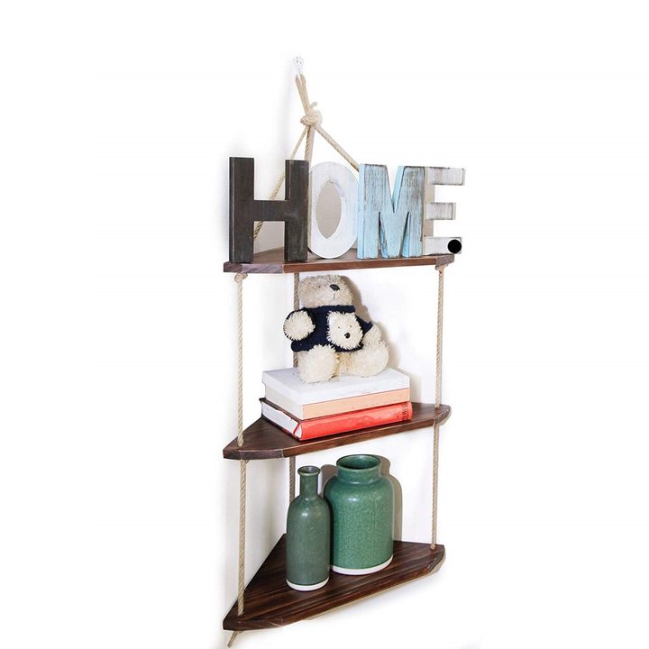 ASLINY Rustic Floating Corner Shelves is a stylish corner shelf that is made of pine wood boards and rope, making it easy to adjust and perfect for both adding a creative touch and providing extra storage space in any room. This corner shelf is a great space-saving option and is useful for displaying collectibles, toys, trophies, small plants, pictures, books and more. This shelf is sturdy and simple to install with easy-to-follow instructions and includes all mounting hardware.