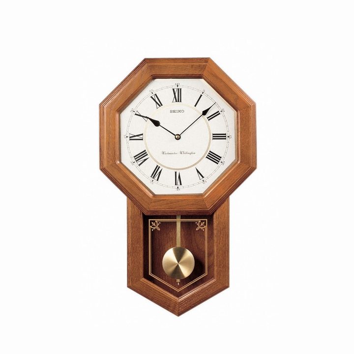 When wood wall clocks are considered, a traditional design typically comes to mind. The Seiko Light Oak Traditional Schoolhouse Wall Clock with Chime & Pendulum is a great wall clock option. Its octagonal, off-white clock face features the expected Roman numerals and also offers an automatic chime silencer if you wanted less time reminders.