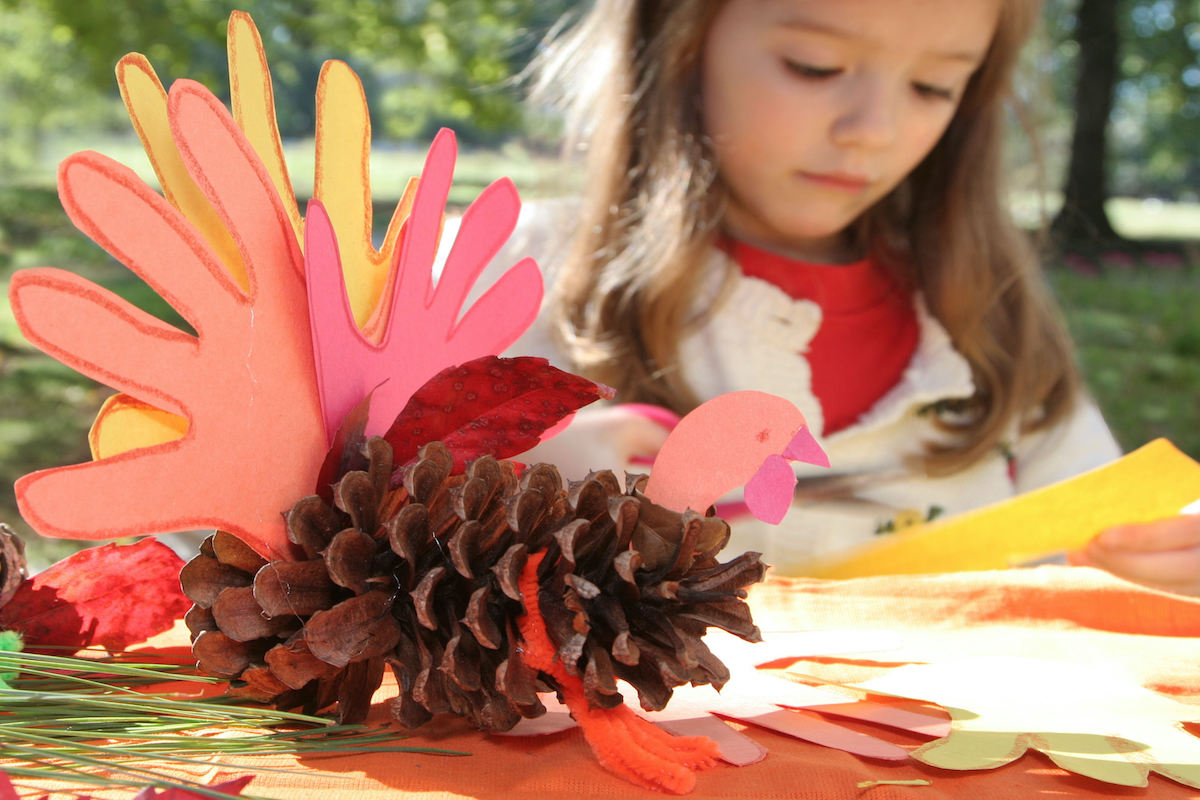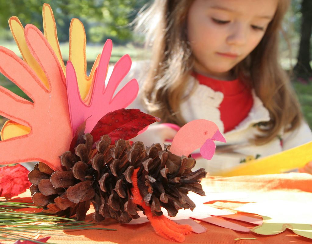 Find several large pinecones — the bigger, the better. Glue the eyes and a small beak to the front of the pinecone. Just like with the tube turkeys, cut out feathers from your construction paper and encourage the kids and other guests to write what they’re thankful for on each feather. Next, glue the feathers to the back of the pinecone to share everyone’s happy thoughts.