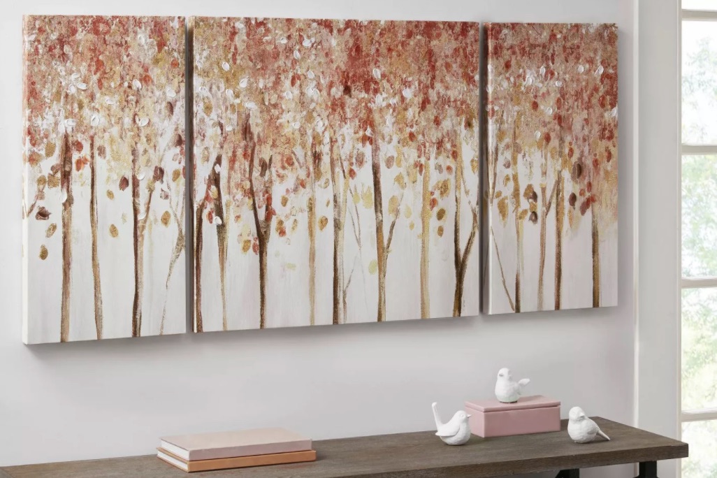 Bare walls are a surefire way to make your office feel more like a stale cubicle than a homey space. Add some excitement with this Autumn Harvest metal wall plaque from Kirkland’s for its farmhouse feel. We recommend adding it behind the desk to add a subtle but festive background for your Zoom calls. While you’re there, take some time to check out this Autumn wall art for a more minimalist option of fall-themed word art. For a more expansive space, you’ll need something a little bigger on the walls. Target is up to the task with this colorful set of Buy at Walmart depicting the changing leaves of the season.