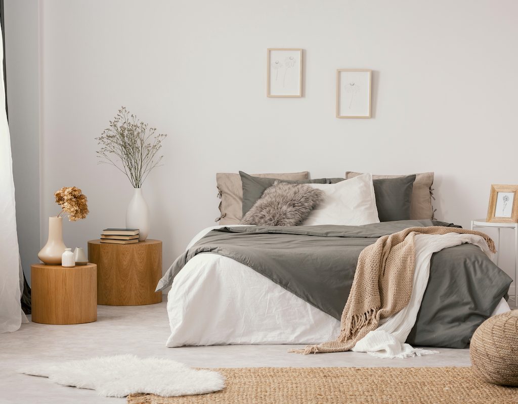 Commonly, an area rug fits right underneath your bed and extends for a few feet on either side. To decide how large of a rug you’ll need, measure your bed plus any bedside tables or lamps you’d want entirely on the rug’s surface. Keep in mind that covering this much area necessitates a fairly large rug, and this can get expensive.