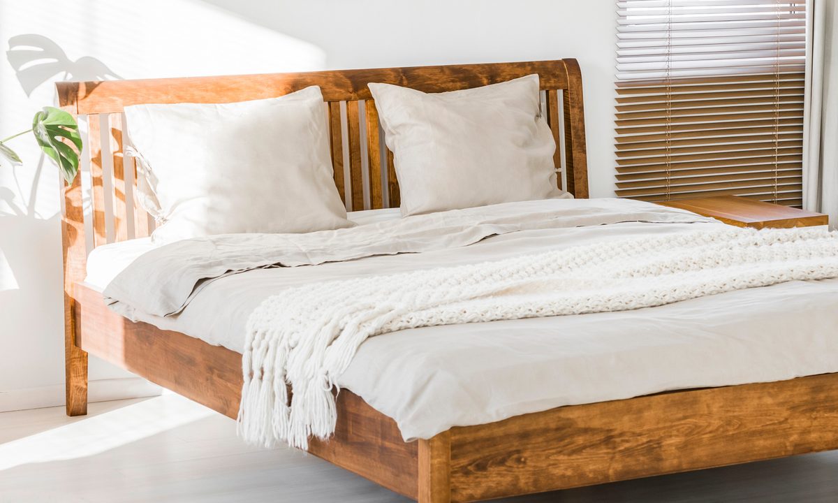 Today’s modern aesthetics often showcase natural materials. Dark oak wood on dressers, headboards, and tables is common in modern roomscapes. However, unless you want a rustic-modern room design, we recommend decorating your space lightly with natural materials. A wood headboard and dresser can be enough to add an organic touch. Or, add a few plants, like a fiddle-leaf fig, to invite a more biophilic aesthetic to your room.