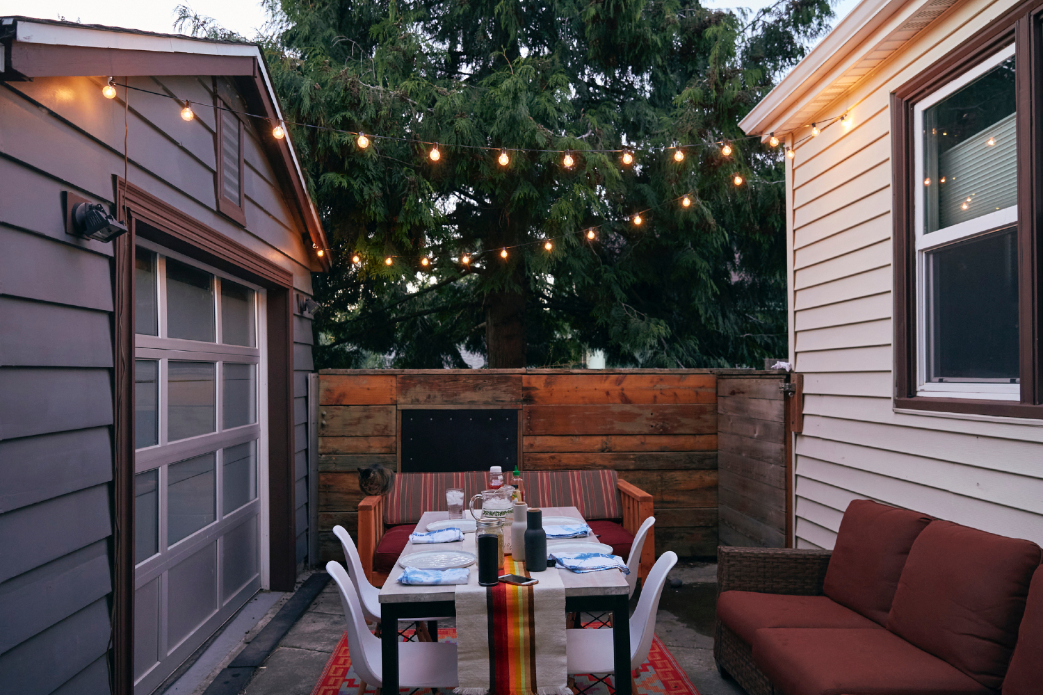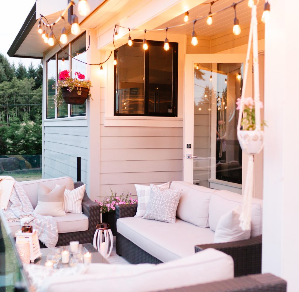 Deep red pairs well with the brown tones of wood and other natural materials, and this dramatic color scheme is making a significant impression on outdoor design trends this year. Red couch cushions, throw pillows, roses, candles, and more will stand out yet simultaneously act as a complement to any wooden furniture or accents. Be sure to add a few pops of greenery to soften the dark tones and add a little brightness. Further, hanging some string lights will also increase the warmth and functionality of the patio, especially if you plan on spending time outside after dark.