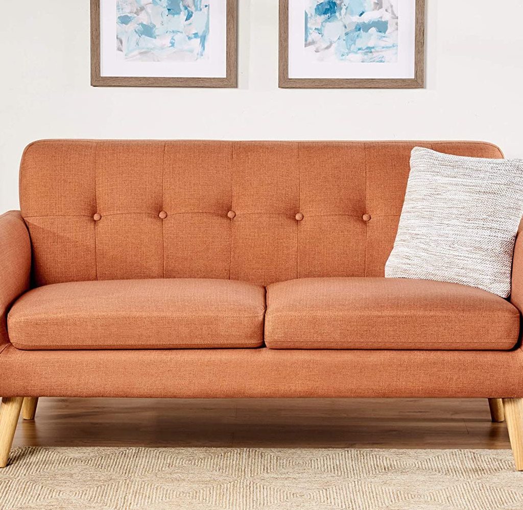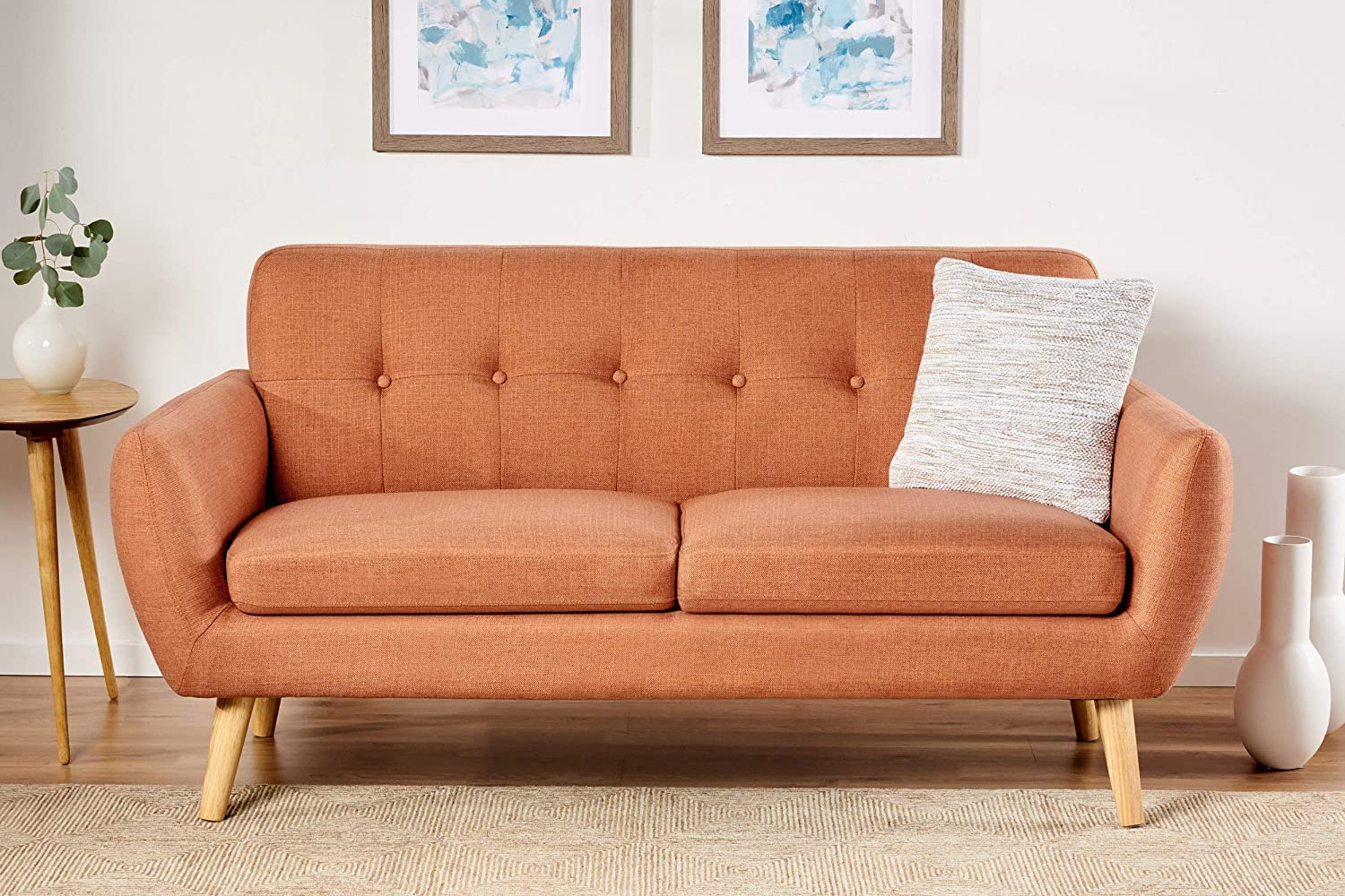 This sofa is ideally suited for small spaces, measured at 67.25 inches in length. It comes in a bright burnt orange color but is often available in blue or dark grey. The design is contemporary and features the signature raised legs of 1950s furniture. As one of the most eclectic items on our list, those inspired by vintage home designs will fall in love with this loveseat.
