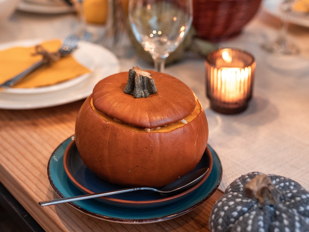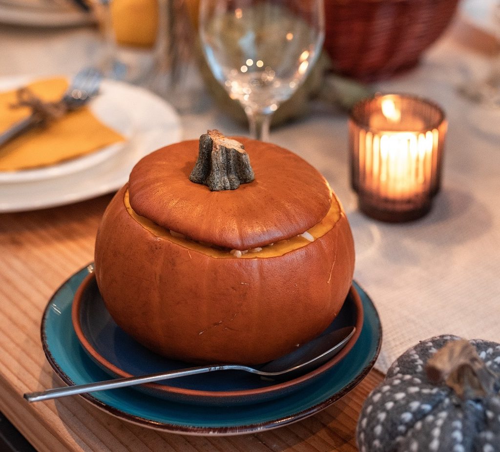 If you love a more natural look, why not use what the season gives you? We love the idea of carving out squash, pumpkins, and gourds and using them as serving dishes in the middle of the table to serve squash casserole or sage dressing. You can also find small pumpkins and serve a soup course inside. For dessert, carve out a pear and serve a warm pudding. It’s a cheap and easy way to use everything you’re already cooking with and limit food waste.