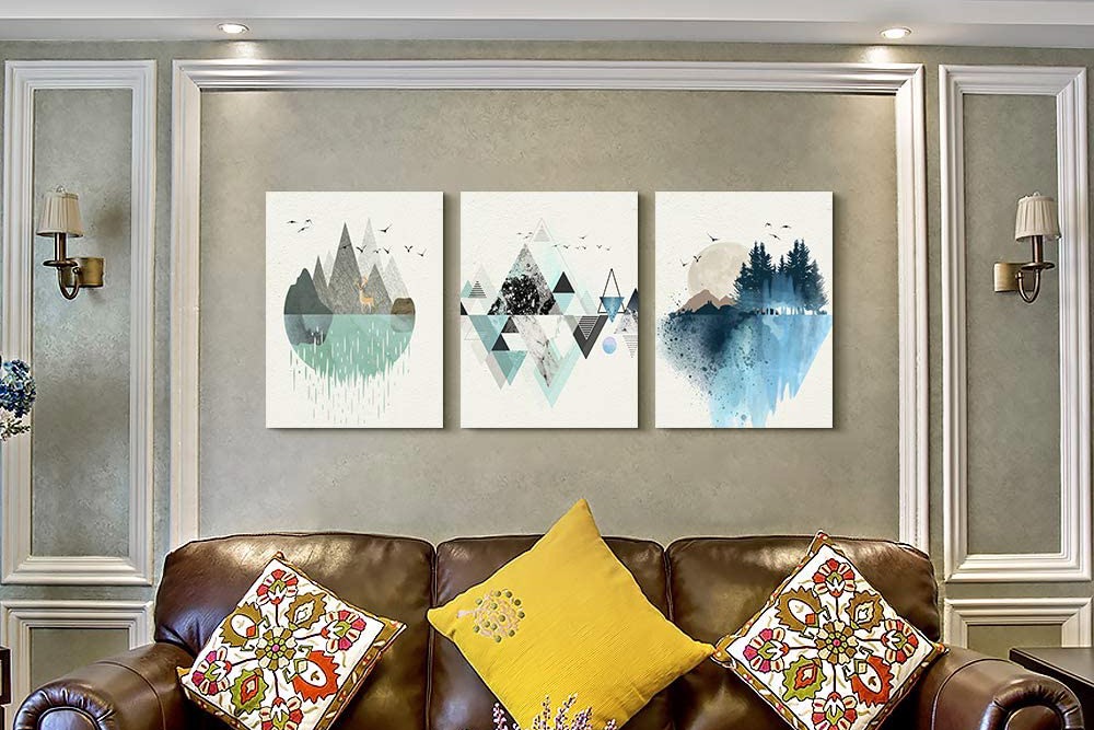 Bold and stimulating, MHARTK66’s abstract geometric wall art depicts three natural scenes on separate canvas panels. Mountain lakesides and overhead birds are the principal subjects painted in cool tones of grays, greens, and blues. Each print measures 12 inches wide by 16 inches tall.