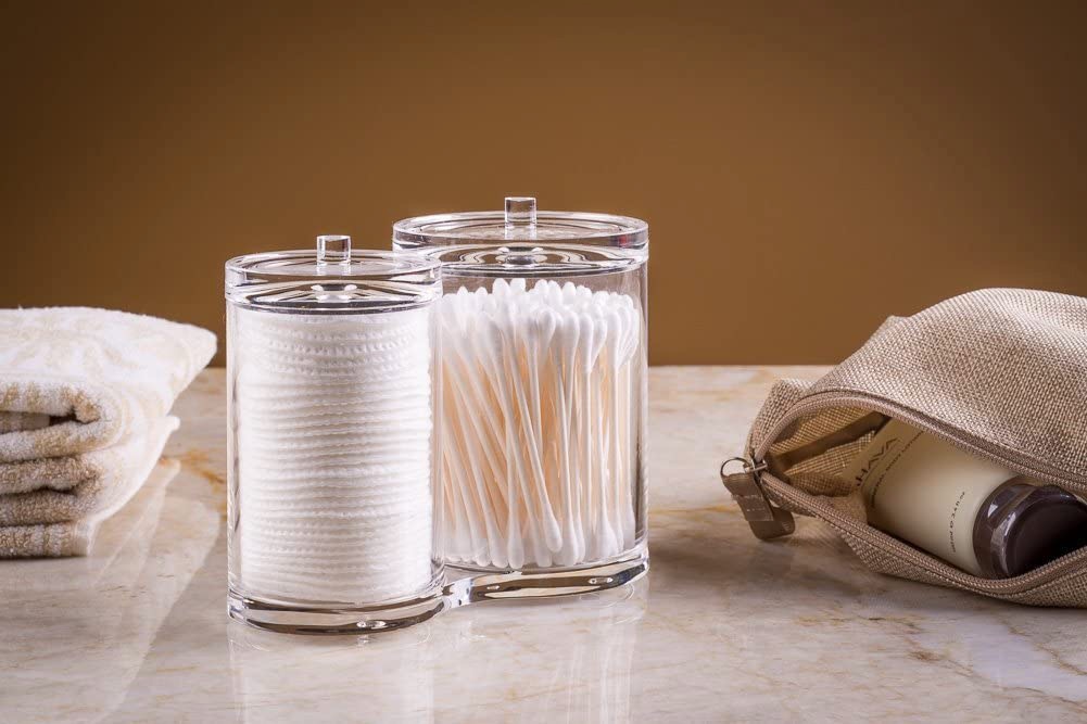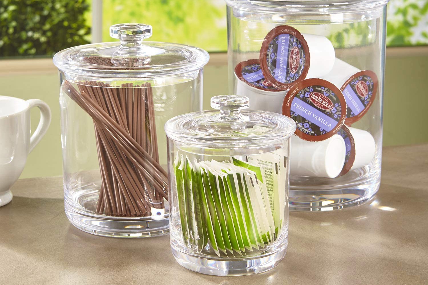 The acrylic plastic jars are made to fit your bathroom vanity, kitchen counter, and even your living room coffee table. These versatile jars are food-safe and can hold anything you would want to store beautifully.