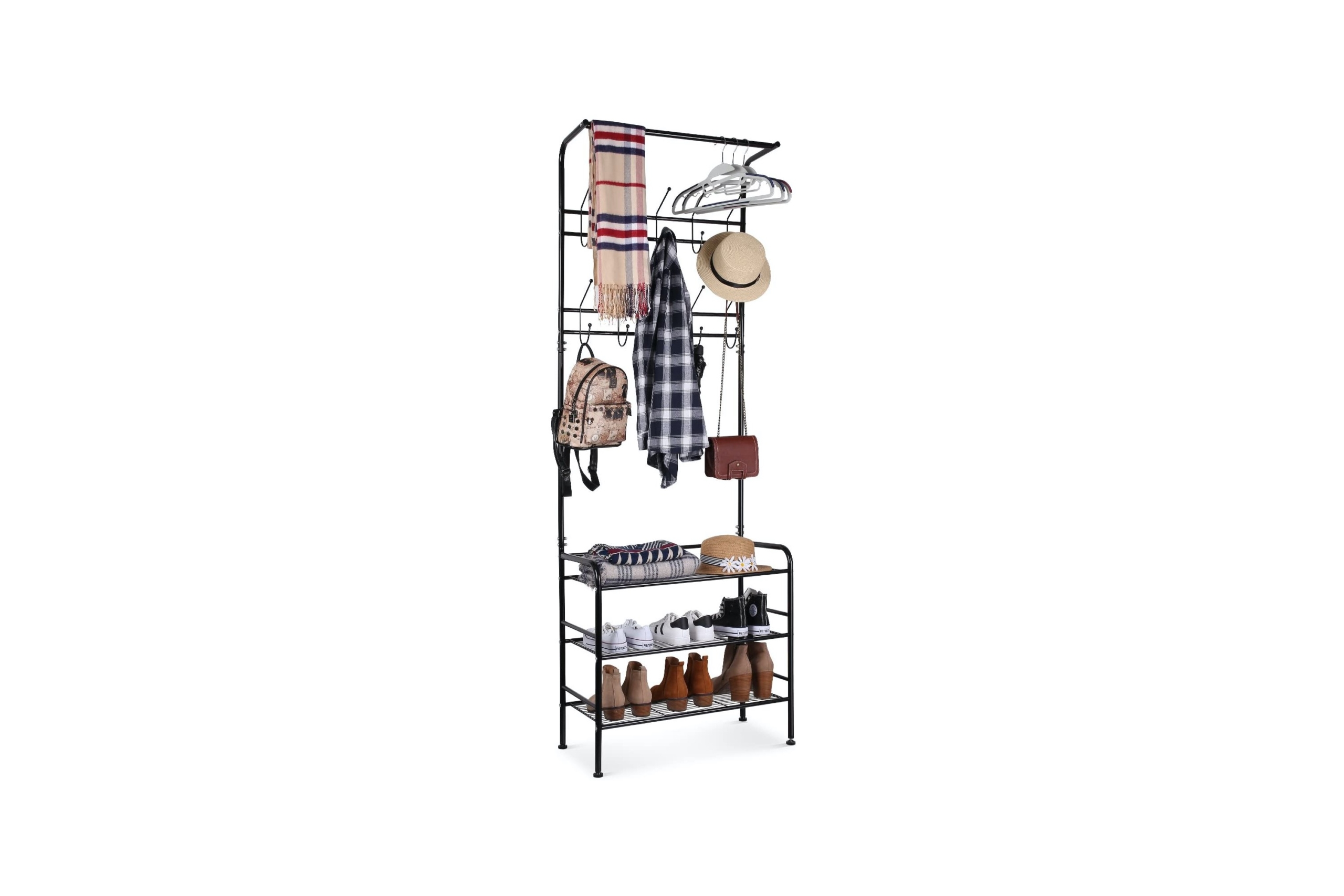 With a minimalist design and a modern look, the Homfa Metal Entryway Coat Shoe Rack is an excellent budget solution for your storage and organization needs. Made from iron metal, it is a durable garment rack that features 20 hooks and three shelves for your shoes or other items.