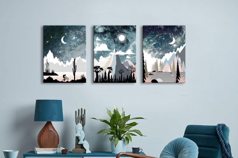 Searching for a bedroom painting that really catches your eye? Then take a gander at the CANVASZON Wall Art for Bedroom, which ranks high as a best-looking painting for a bedroom. The three-piece panel artwork features an attractive abstract theme that incorporates space, stars, the moon and the sun, mountains, trees, water, and other pleasing elements. Each panel measures 12 by 16 inches.