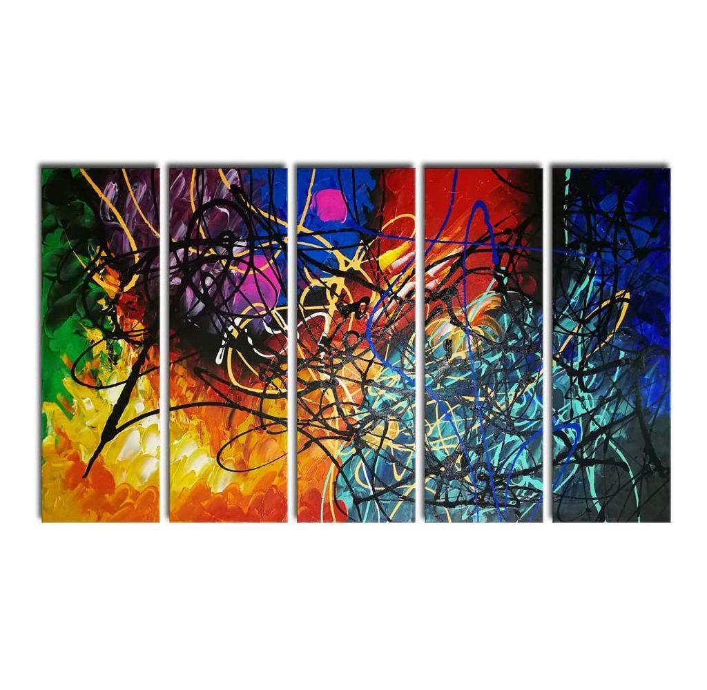 Hand-crafted on high-quality canvas, the Wieco Art Colorful Abstract Oil Painting is a striking piece made by a professional artist with years of experience in this medium. It features five panels of stretched and framed canvas oil that are ready to be hung to transform your wall into a modern art museum. Each Wieco Art canvas piece is packed in a carton box with the printed logo for authenticity.
