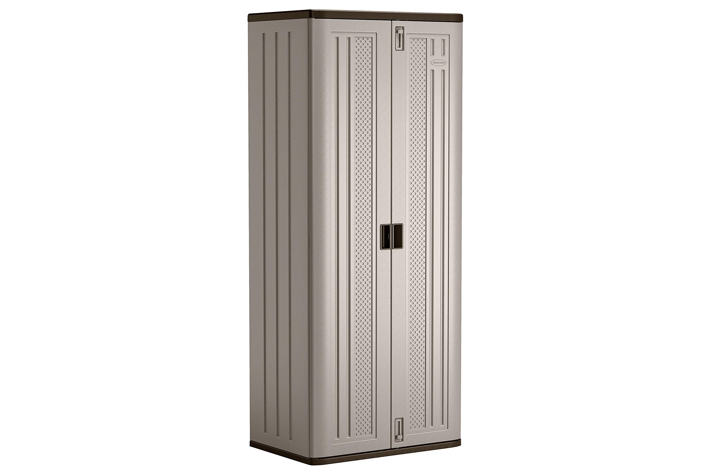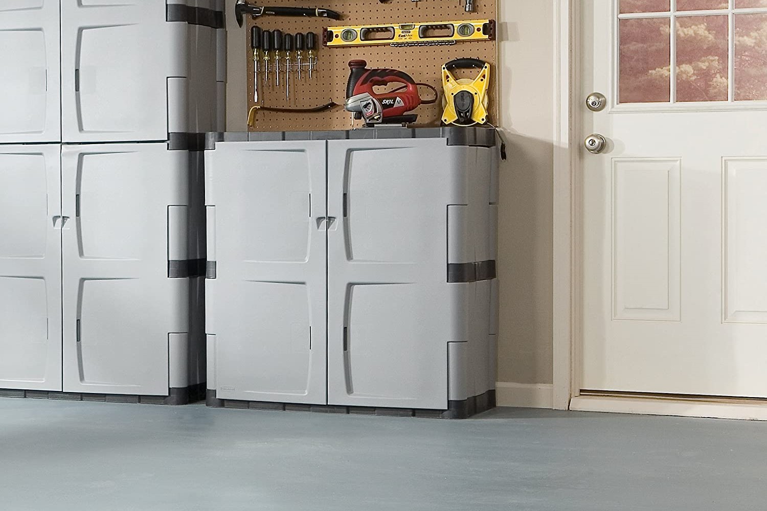 To gain a lot of storage space in a plastic store cabinet, consider the Suncast Base Storage Cabinet. The 72-inch-tall cabinet features metal-reinforced shelving that can hold up to 75 pounds and doors that lock to protect valuables. It sports double-wall resin construction that’s resistant to warping, rusting and denting. The platinum storage cabinet can fit in a corner of a garage.