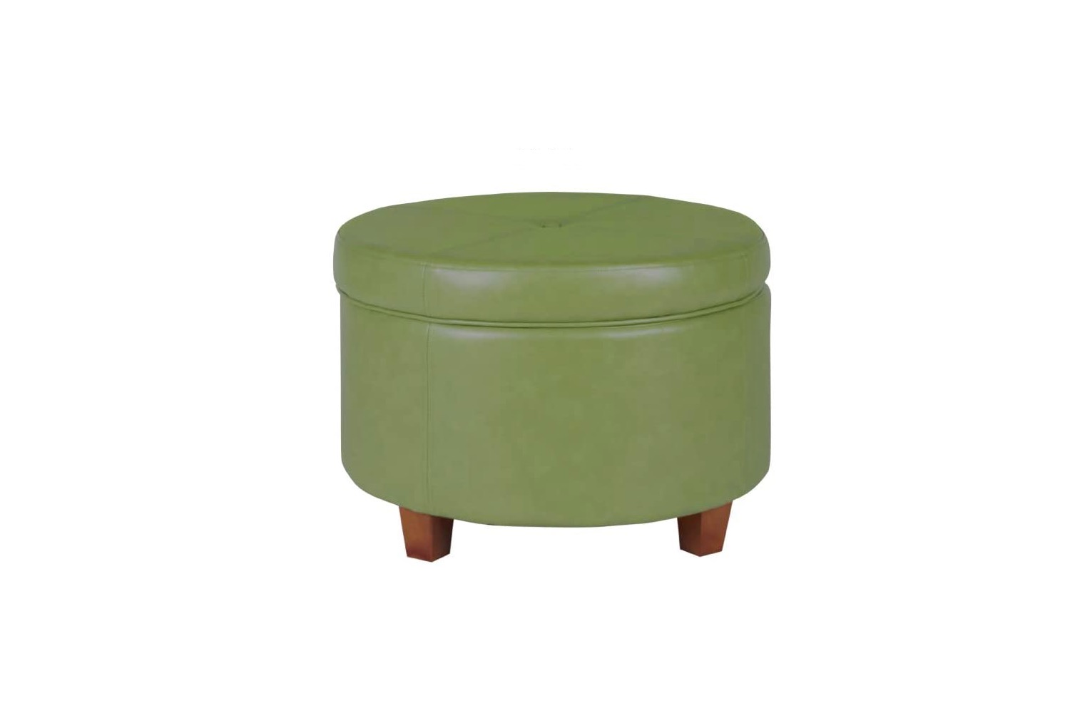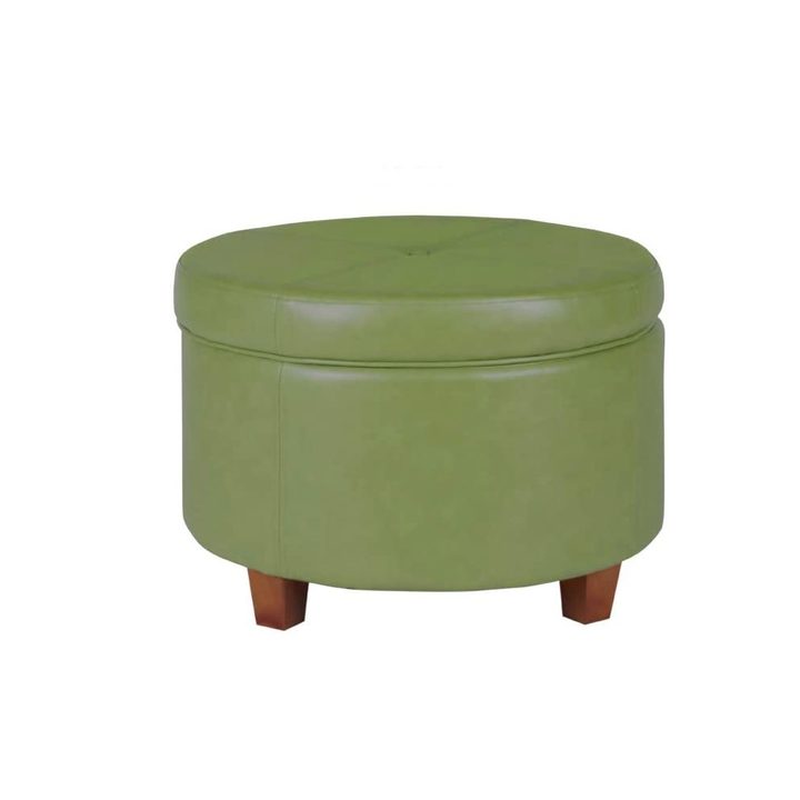 Give your room a pop of color and style with the HomePop Round Leatherette Storage Ottoman. The rich, leather-like fabric, tufted buttons, and decorative stitching of this ottoman give it a classy feel that is timeless. It features solid wood legs that are sturdy and enhance the elegance of this piece.