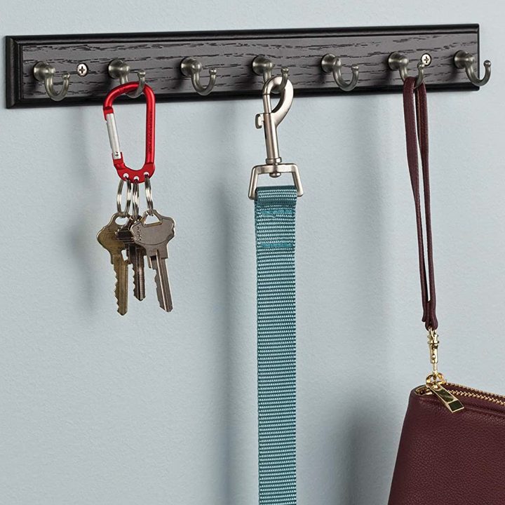 The mDesign Wall Mount Entryway Organizer is one of our favorite key holders. It features five hooks and a super-useful organizing basket to store important mail, notes, and bills that need to be paid. It creates extra storage wherever you place it and adds a touch of rustic chic to your home.