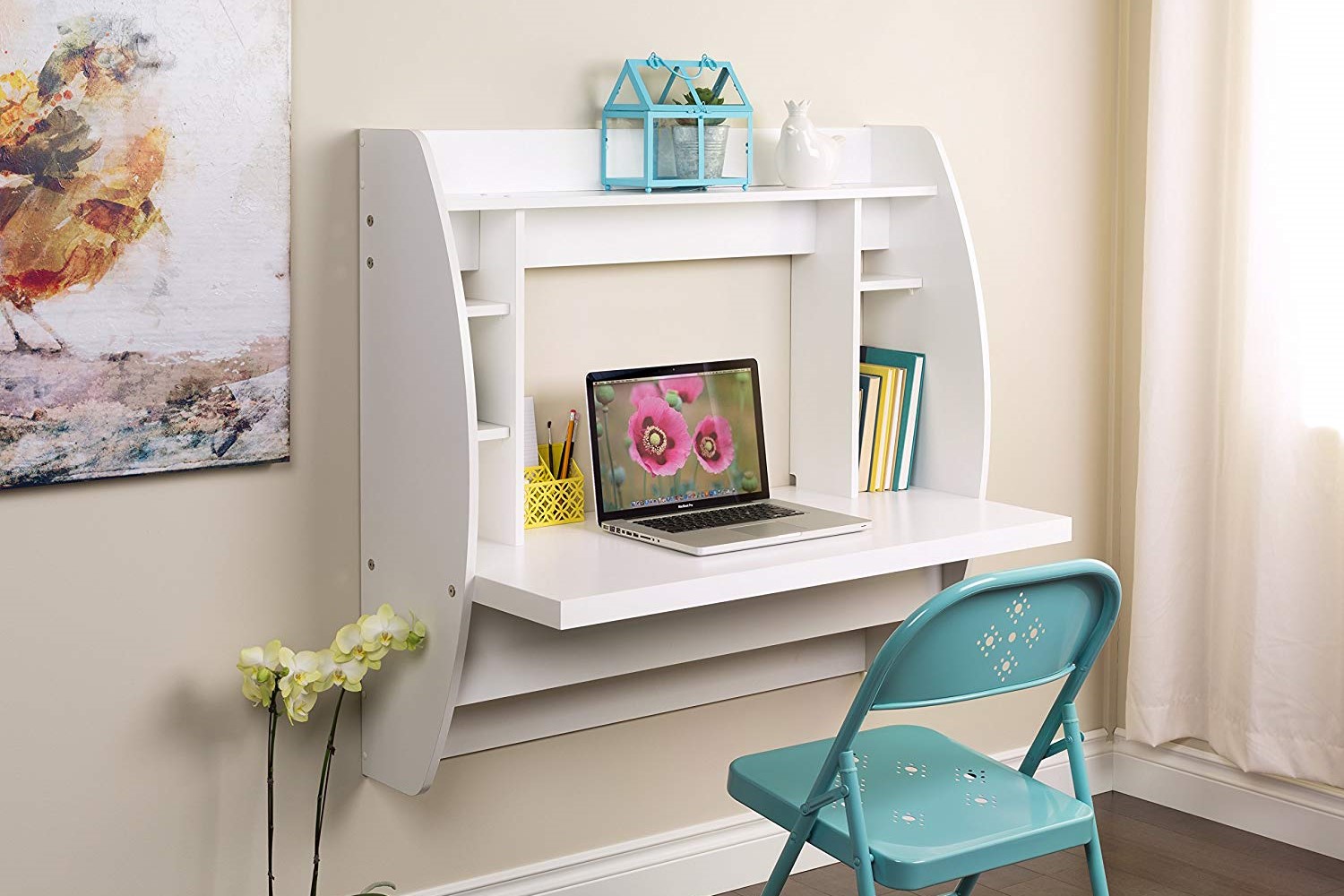 Limited space should not compromise style or working conditions. The Prepac Floating Desk is a beautiful solution that blends in with your light colored walls and minimalist décor. It mounts at any height for maximum comfort and keeps your items safe with metal hanging rails.