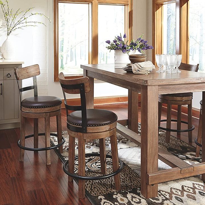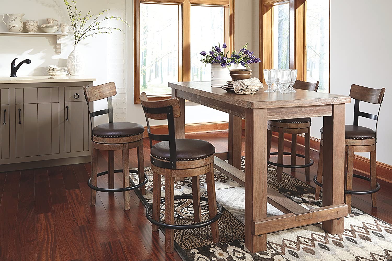 Add a little swivel fun to your seating with the Ashley Furniture Pinnadel Swivel Barstool. This brown, counter-height wooden stool features gray metal accents and antiqued nailhead trim with metal detailing that look polished and sophisticated. Its faux-leather-cushioned seating that swivels will keep the conversation going for hours.