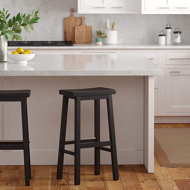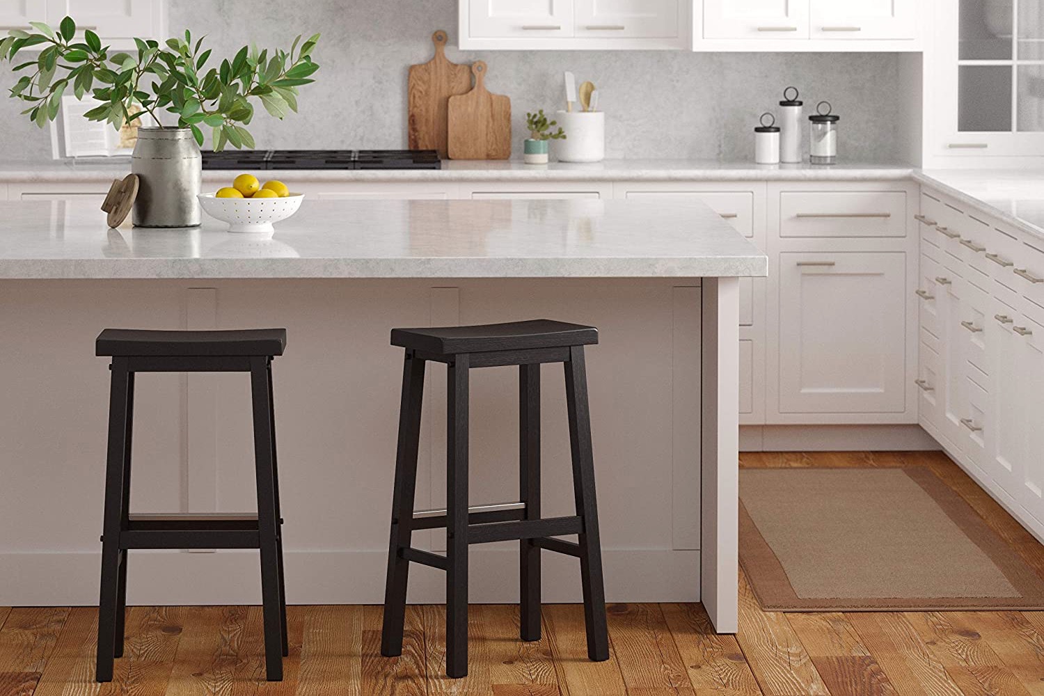The modern design of the AmazonBasics Wood Saddle-Seat counter stools is sleek and polished, to match your contemporary home while making seating comfortable. With their A-frame design and squared legs, these contoured stools are 29 inches in height and have a capacity of 220 pounds. Ideal for counter-height surfaces in all homes.