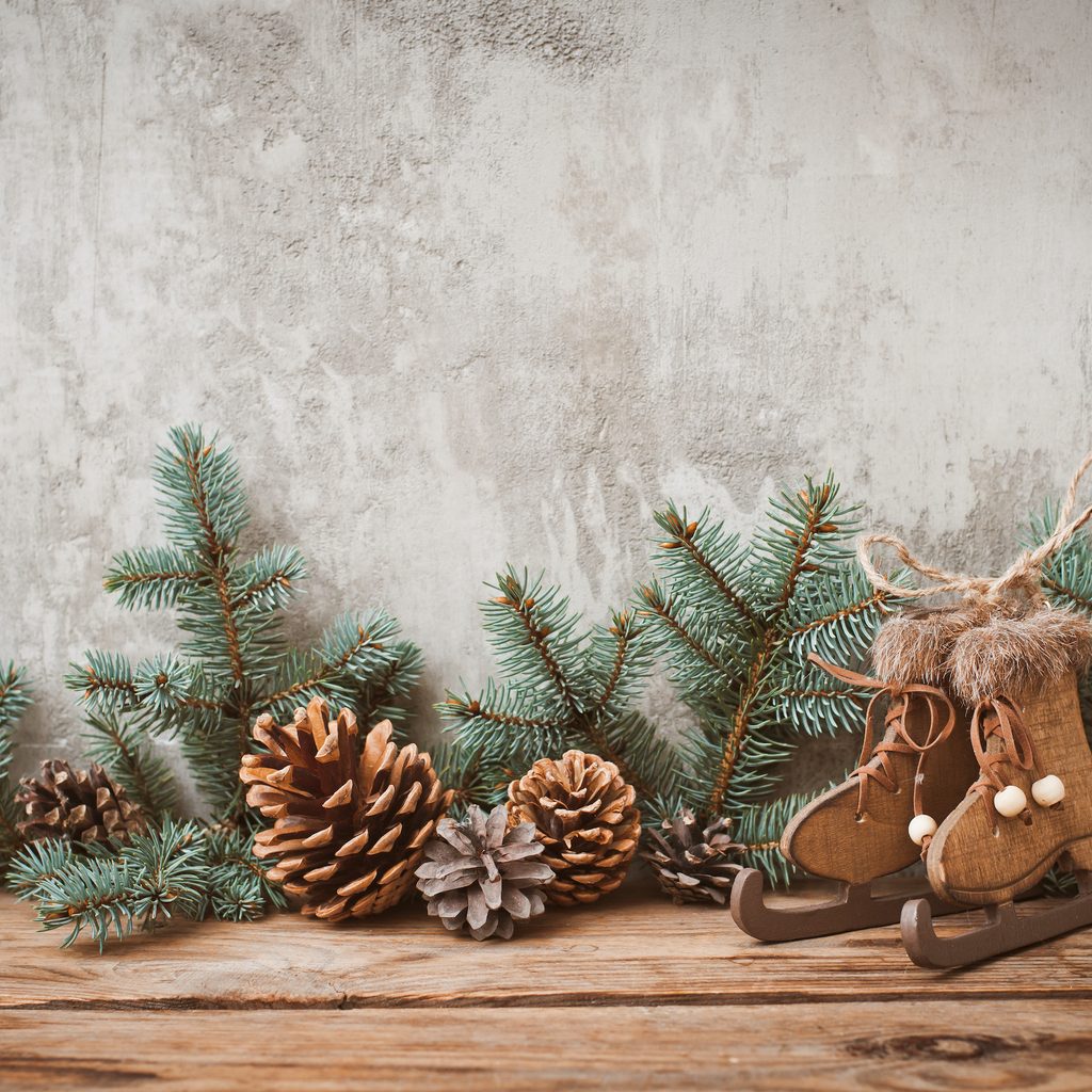 Vintage winter sports equipment can double as excellent porch decor for the snowy season. Make your home feel like a cozy chalet by leaning two wooden skis in an X shape against the wall. With a retro sled, you can create a classic winter vignette by propping it up next to your door. Or use the sleigh to create a unique accent table that you can top with wintery plants, candles, and other decorations. Give your vintage ice skates new life by repurposing them as a wreath. Hang them on your front door with some spruce branches and winter berries for a unique DIY project.